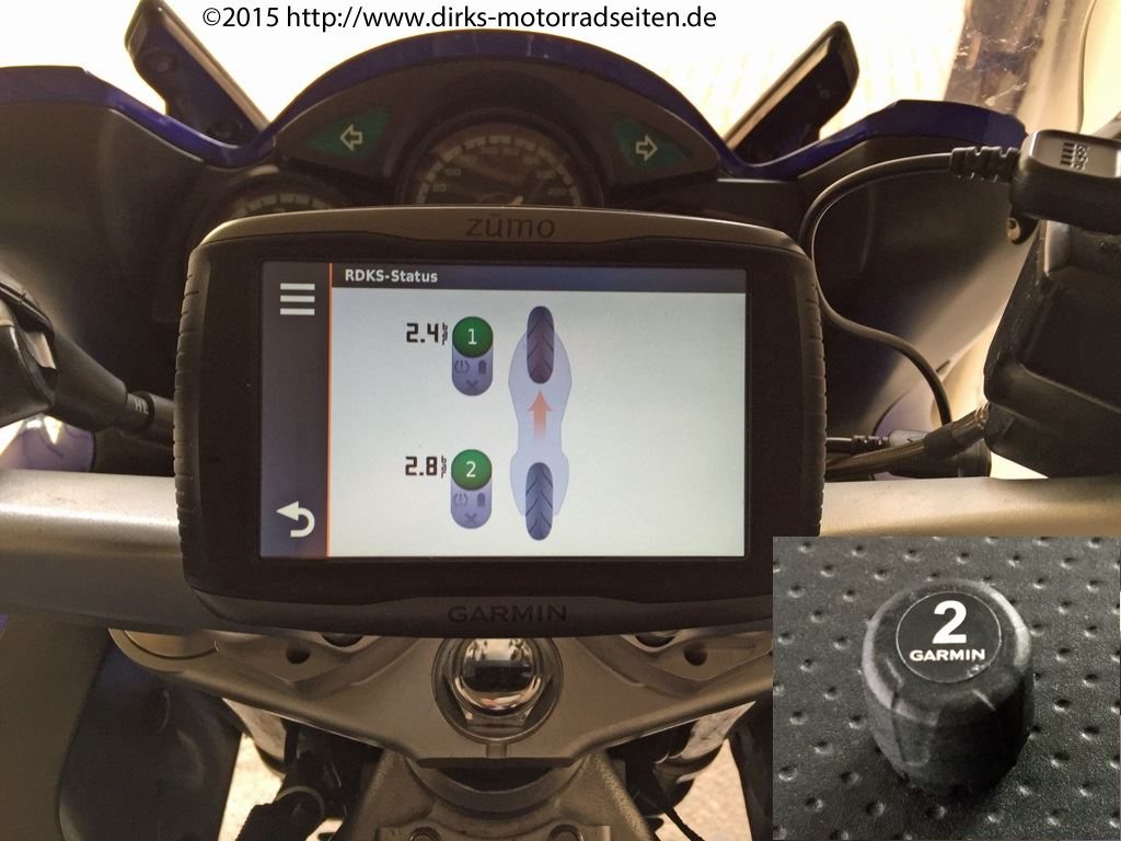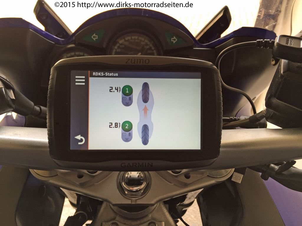 Grundvoraussetzung dazu ist ein modernes Navigationsgerät. Das Zumo 590 LM und das 390 LM erkennen die RDKS-Sensoren und zeigen den aktuellen Luftdruck auf dem Display an. Sie werden einfach auf die vorhandenen Metallventile geschraubt und mit dem Zumo gekoppelt. Die Einrichtung ist relativ einfach, bei Unterschreitung des vorgegeben Wertes erfolgt ein akustisches Signal, sowie ein Hinweis im Display des Zumos.